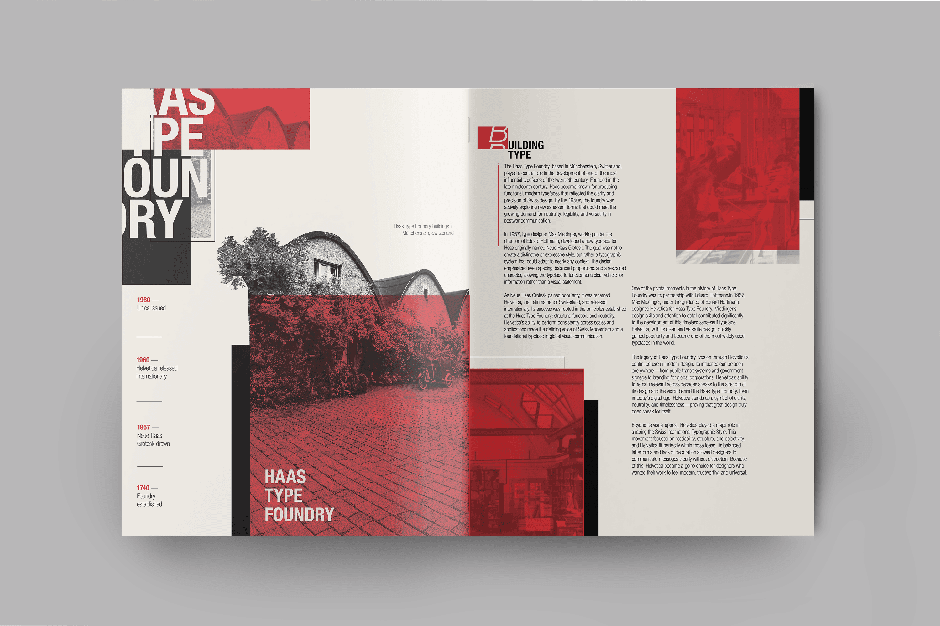 I drew inspiration from classic Swiss design principles, clarity, order, and function, while allowing Helvetica to truly “speak for itself.” The layouts follow a strict grid system, which I explored to create generous white space that emphasizes balance and legibility, while still producing engaging, intentional compositions across each spread.